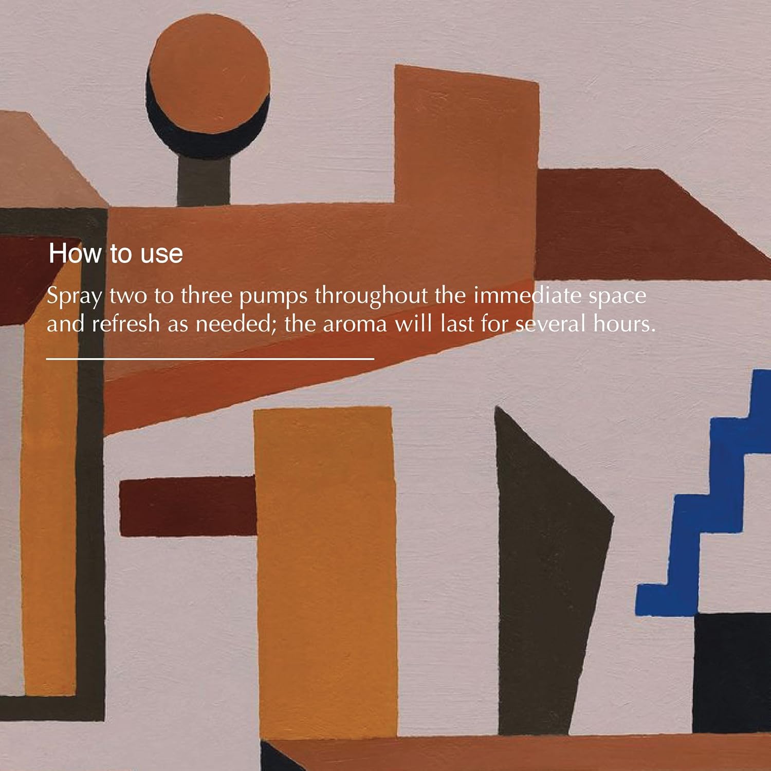 • Usage: Spray two to three pumps throughout the immediate space and refresh as needed; the aroma will last for several hours.